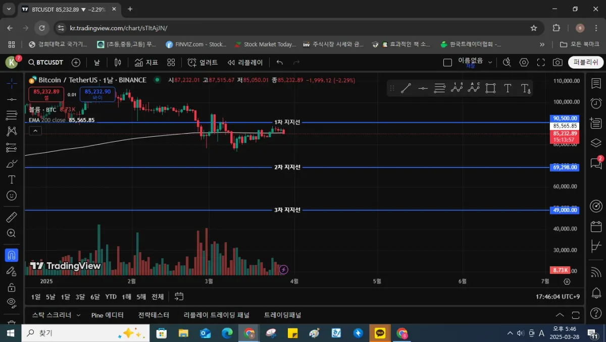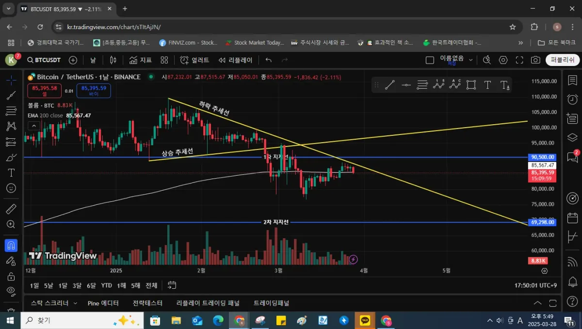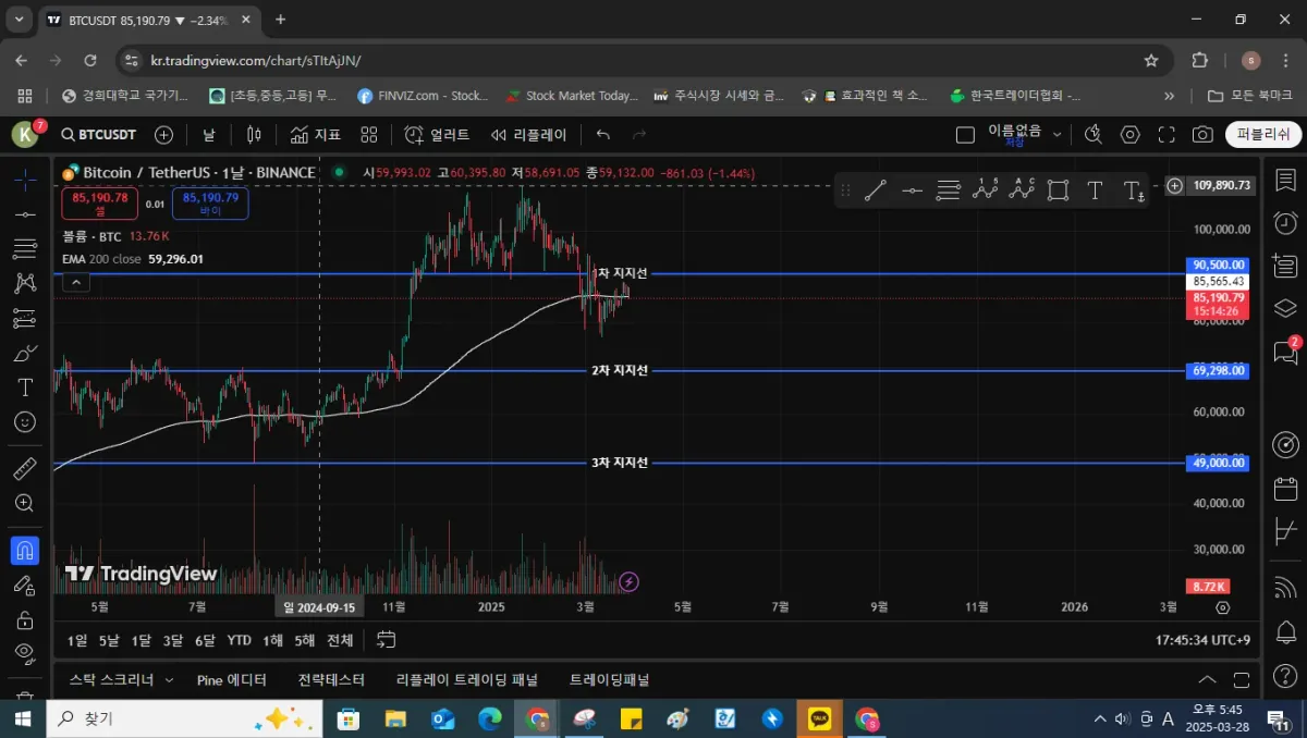 1) 첫번째 사진과 두번째 사진에서, 2024년 08월에 꼬리가 긴 음봉을 3차 지지선으로, 2024년 11월에 거래량이 많아지면서 양봉으로 쭉 올라가는 지점을 2차 지지선으로, 2024년 12월에 위아래로 꼬리가 긴 음봉을 1차 지지선으로 설정했습니다. 2025년 02월 25일에 1차 지지선을 뚫고 계속 하락하여 1차 지지선은 곧 저항선으로 바뀌었다고 봅니다. 이후 저항선을 뚫고자 하는 흐름이 있었지만, 2025년 03월 27일까지도 뚫지 못하는 것을 보았습니다.