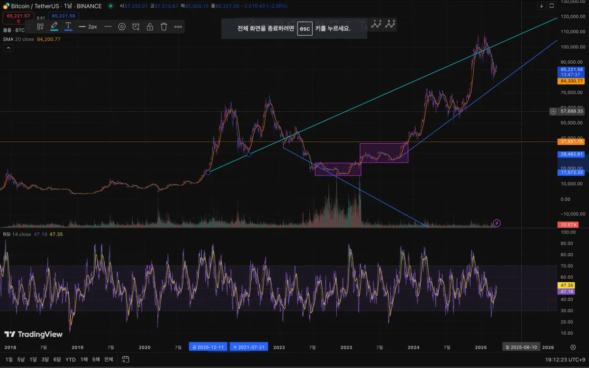 일봉과 몇년 사이의 움직임으로 봤을때 아직 코인 가격은 상승 지지선 밑으로 내려오지 않았으므로 아직까지는 비트코인이 강세시장이라고 생각합니다.