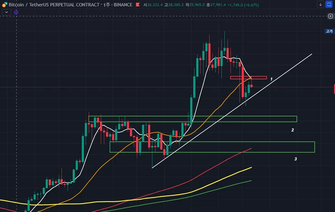 비트코인 주봉입니다. 매물대로 보이는 구간을 표시했습니다