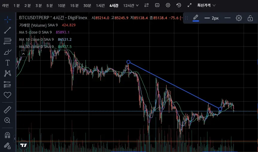 현재 비트코인 차트를 볼때 고점을 계속해서 낮추면서 하락하는 싱황입니다. 하지만 추세선 끝에 상방돌파가 나와주면서 하락추세는 약간은 꺾이고 현재 박스권 횡보중입니다. 현재 시황과 차트를 볼때 하락장임에는 분명하므로 대응을 잘 해야할것같습니다.