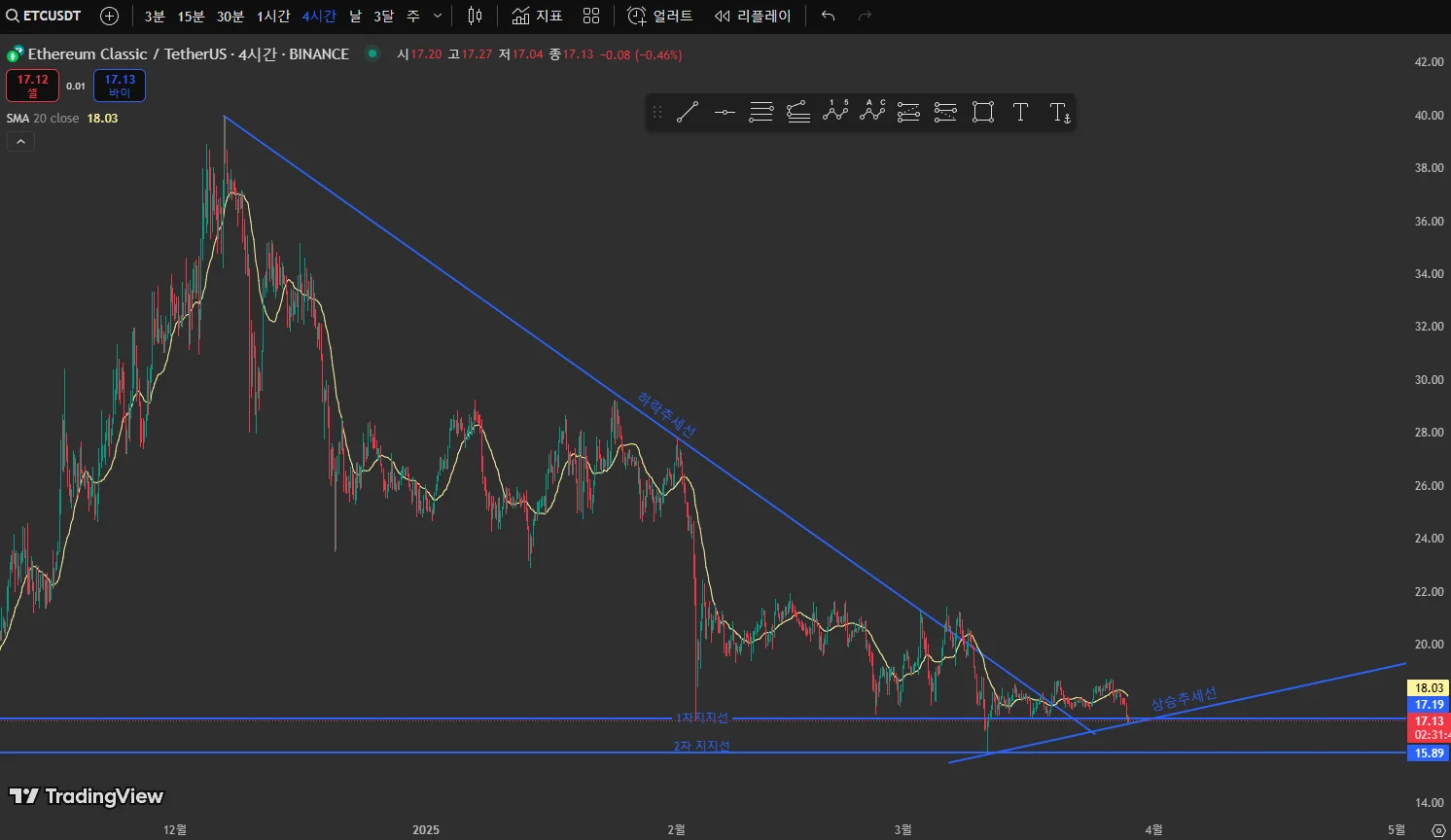 작도해놓고 보니깐 현재의 시점이 매우 유의미한 구간인거같습니다. 1차 지지선에서 몇번 지지해주면서