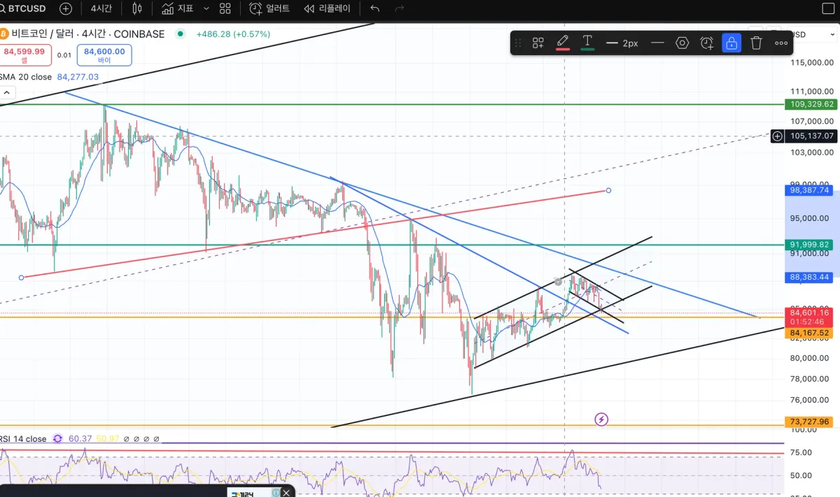 빨강선 파랑선 삼각수렴 하향 돌파후