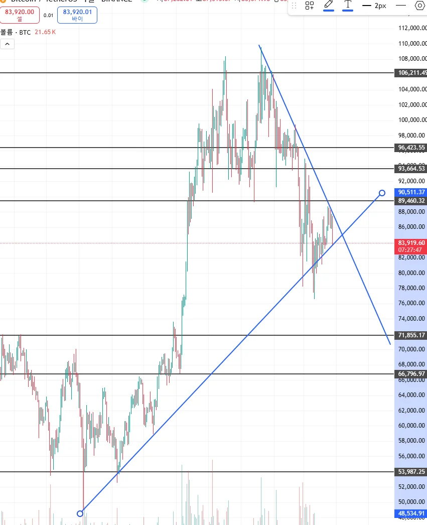 현시점 상승세가 이루어진 후 하락추세선 돌파 이후 89k(유의미한 저항선)에 일봉, 주봉 모두 안착해야 추세 전환이 된다고 생각합니다.