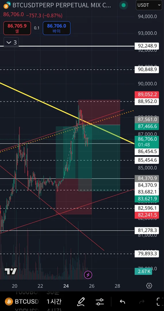 마지막으로 1시간봉에서 점선으로 지지저항을 파악하고,