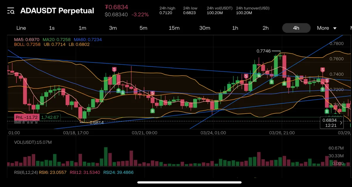 횡보 중 삼각수렴 형태가 보였고, 대기중에 상방 이탈 후 리테스트까지 거친 모습을 보고 long 포지션 진입하였으나 이후 지속적인 하락으로 손절했습니다.
