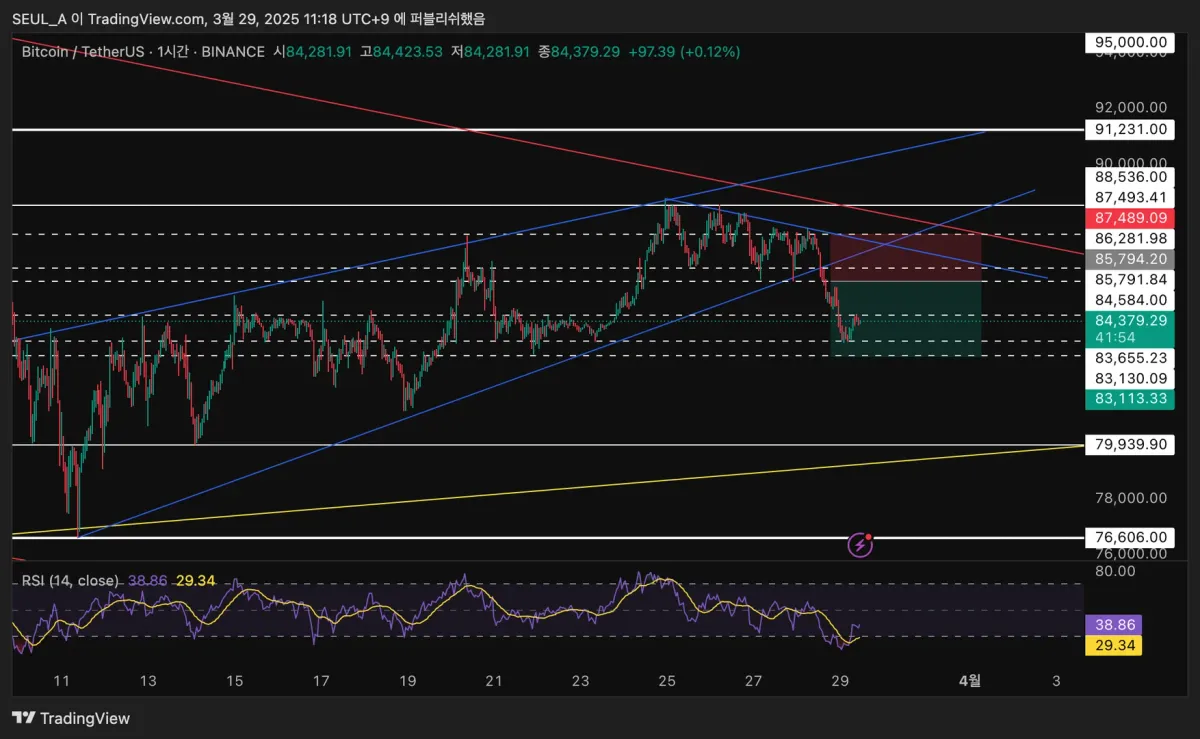 18일차 수업을 보고 순서대로 일봉, 4시간봉, 1시간봉 순으로 분석을 하였고 1시간봉을 확인했을때 라이징웻지 패턴이라고 생각하고 하방 이탈하면 리테스트를 보고 진입하겠다고 생각했습니다.