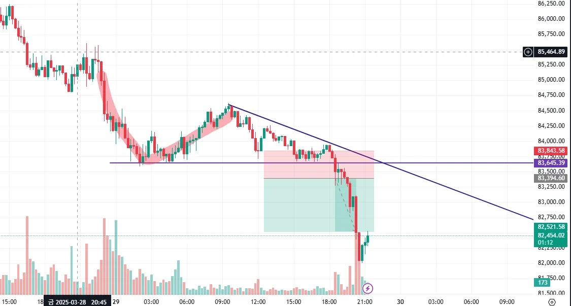 V자 반등이 나온 부분에 지지선을 그렿고 하락 추세선에 저항을 받으며 지지선을 밑으로 뚫고 내려갔을때 숏포지션 진입하였습니다. 익절 기준이 없어서 차트를 보다가 어느정도 양봉 캔들이 나왔을때 익절하였습니다. 익절 기준을 어떻게 잡아야하는지 궁금합니다