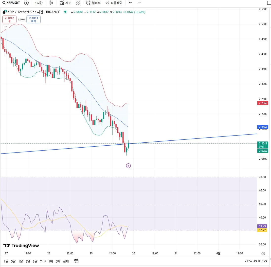 30분차트와 1시간 차트에서 RSI가 상승 추세에 있고 볼린저 밴드 하단에서 지지를 받고 올라오는것을 보고 리플 매수했습니다.