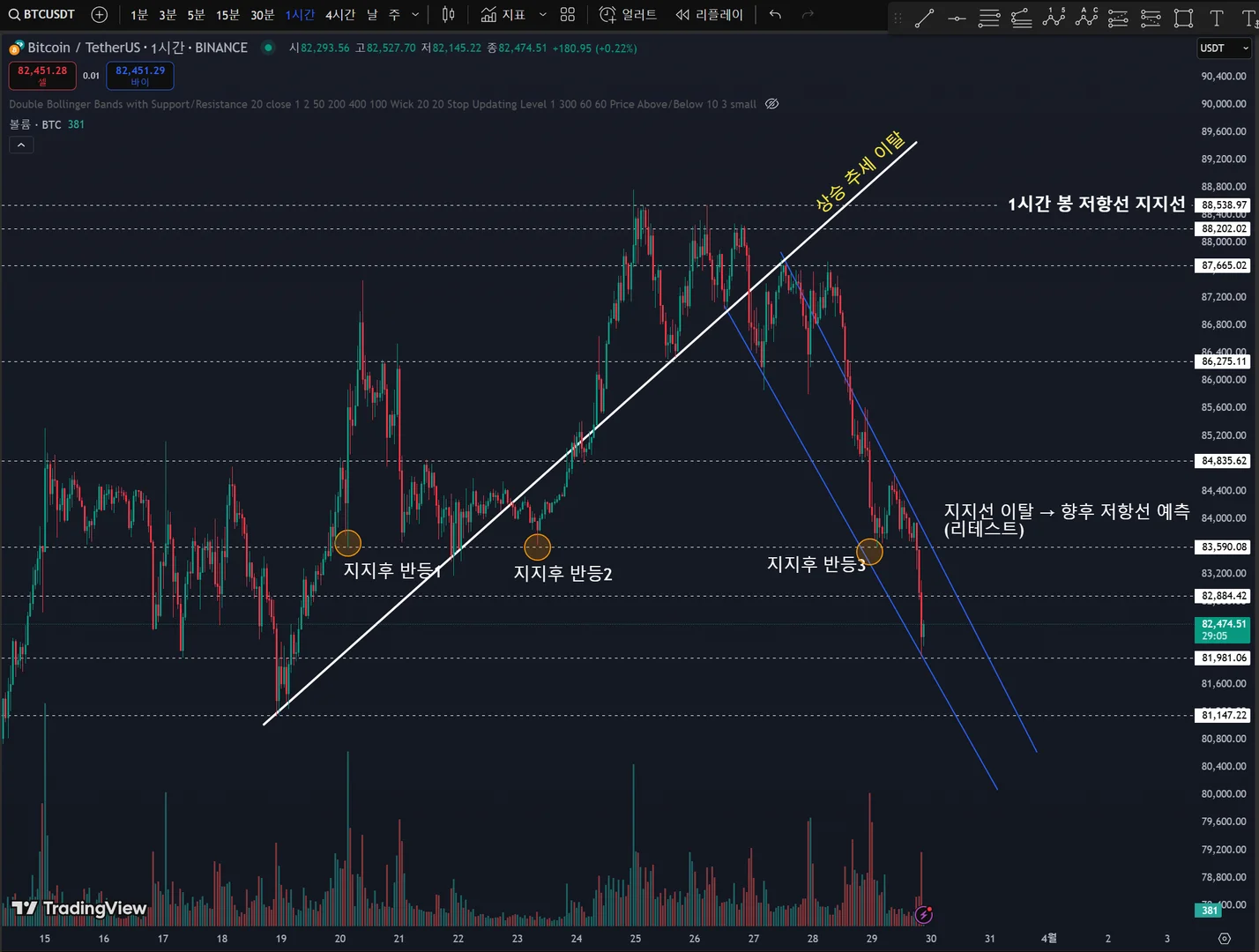 7.하락추세선 상단을 터치 후 하락이 시작될 때, 숏 포지션으로 하방을 잡아 81147.22 선까지 보면 어떨까 생각해 봤음.