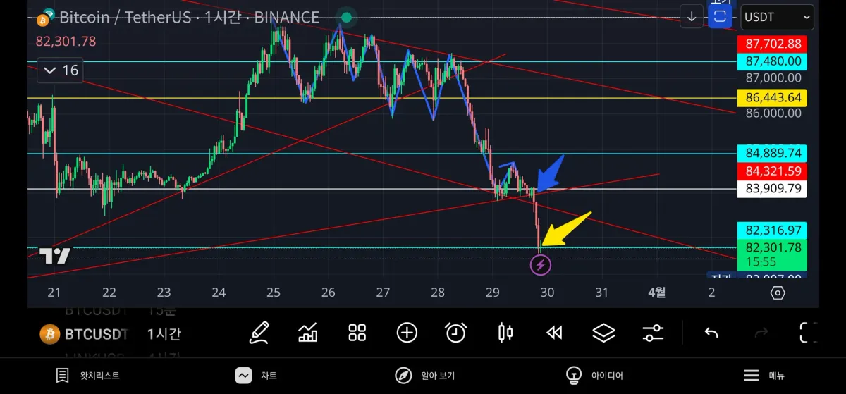다우이론으로 고저점이 내려가고 제일 상단 파랑저항선의 저항을받고 빨강 상승추세선 아래로 돌파하는 것을 보고 하락추세로 판단했고 파란색 화살표 부근에서 흰색 지지라인이 깨지고 두번째 빨강 상승추세선 밑으로 돌파되는걸 보고 더 떨어지겠다는 판단이 들어 진입하여 하단 지지선에서 익절하였습니다