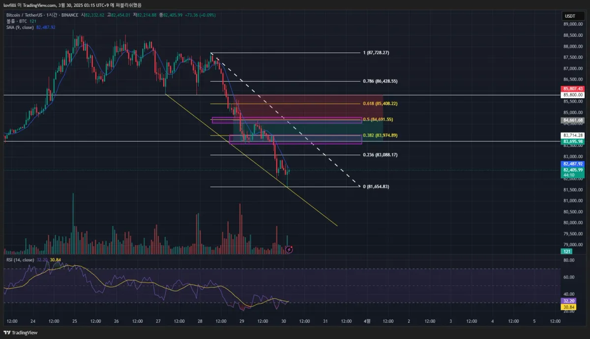 2. 4시간 봉으로 보았을 때 83714 부근에서 지지선이 있었지만 지지선을 강하게 뚫고 하락함