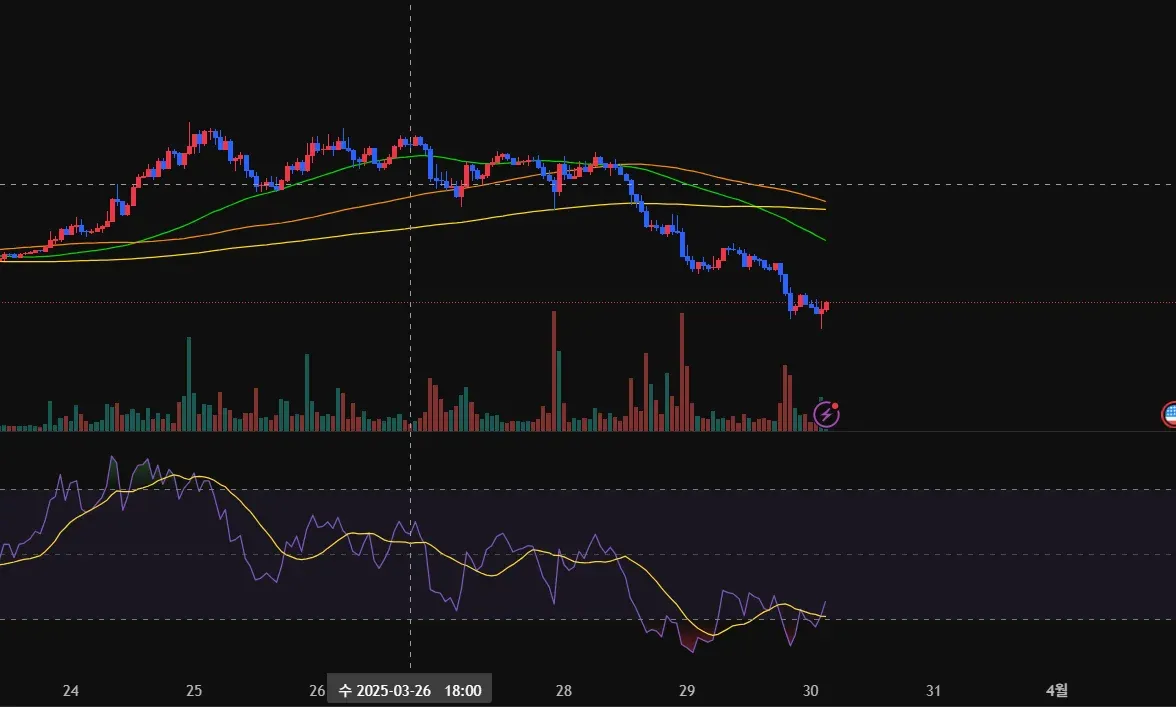 rsi지표를 보았을 때 과매도 구간에서 돌파 하고, 추가로 거래량도 줄어드는 것이 확인이 되어 상승할 것으로 보여집니다.