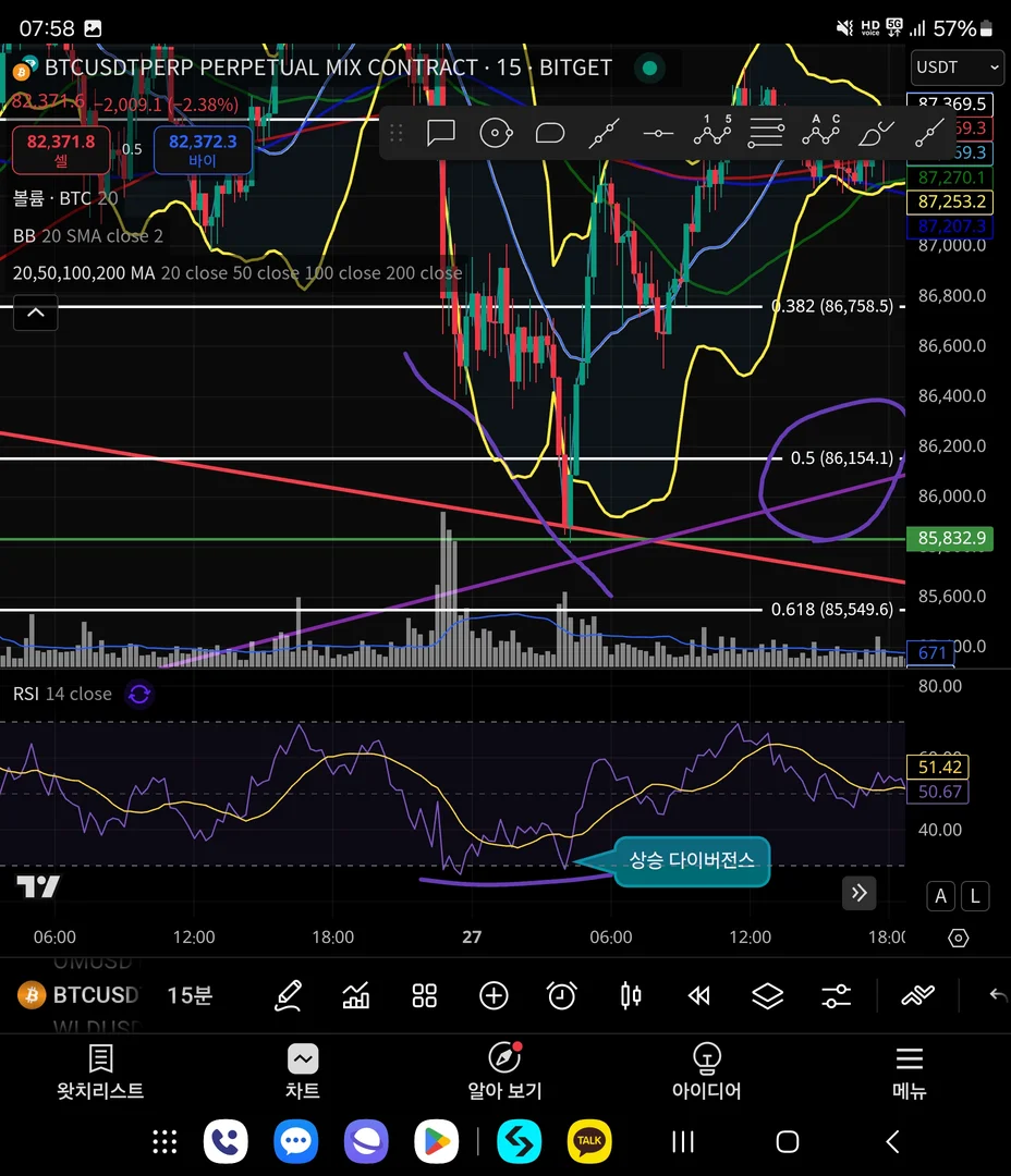 3)5분봉 과매도구간 및 15분봉 RSI 상승 다이버젼스 확인