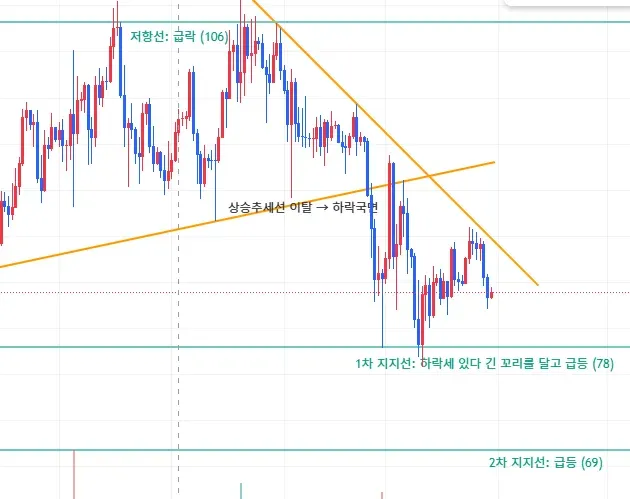 제가 작도한 지지선 및 저항선이 가격 차이가 커서 의미를 찾기 어렵습니다.