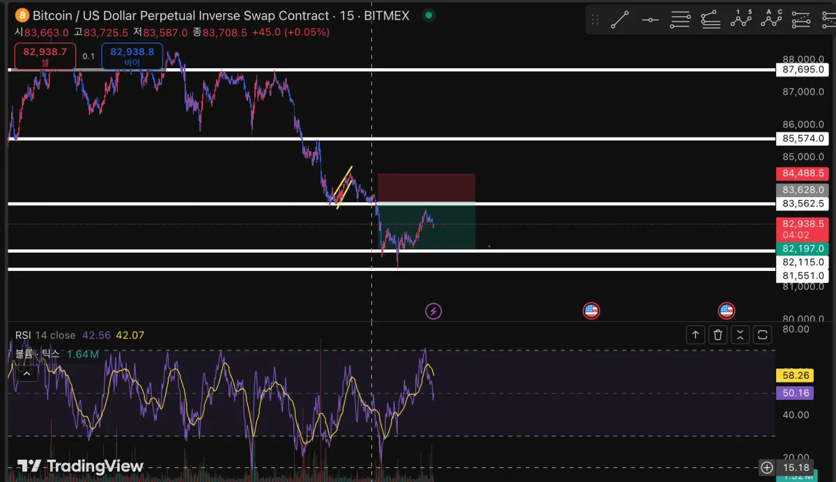 숏 포지션 진입 후 익절은 가로줄 근거로 지지받고 올라올 것으로 예상하여 익절 타이밍으로 생각했습니다.