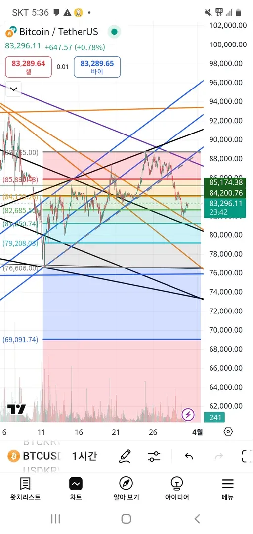 최근 비트코인 1시간봉 상승쇄기형 패턴이 나오다 내리꽂았네요. 하락 두번째 뼈대에서 지지받고 반등중입니다.