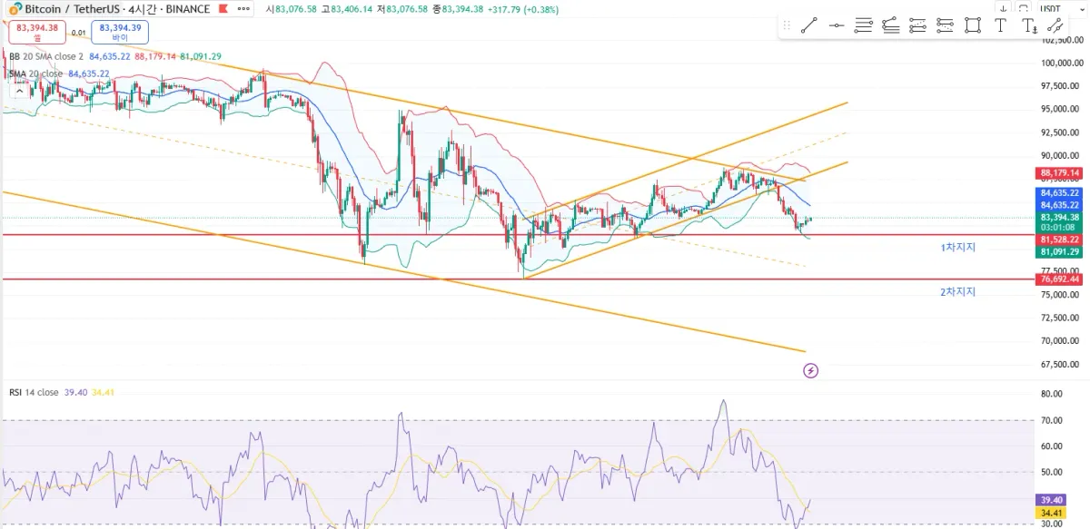 중장기 하락채널이 안에서 여전히 벗어나지 못하고 있는 모습을 보여주며 단기 상승채널도 완전히 이탈해버린 모습을 관찰해볼 수 있겠습니다. 1차 지지에서 두번 지지 받았으나 다음 리테스트 때는 중장기 하락채널 중단 및 2차 지지 라인까지는 봐야할 듯 합니다