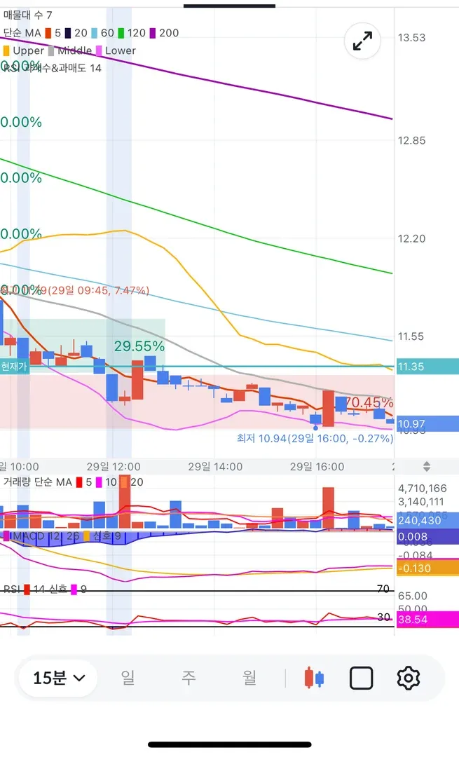 pc에러로 모바일캡쳐 했습니다 3월29일 오후13시 기준15분봉 평단최저 이평선기준5일선까지 떨어져져반등예상하여 진입 15분봉 윗꼬리 미세한 음봉 2번 나타남 0.89% 50%익절 15분후 0.35%로 수익하락아야 나머지금액 익절했습니다