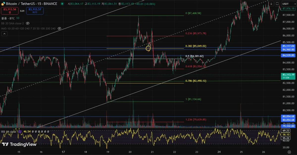 강의에서 알려주신 거래량이 많은 곳을 이용해서 지지/저항선을 찾았고, 찾은 지지/저항선이 피보나치 0.382와 겹치길래