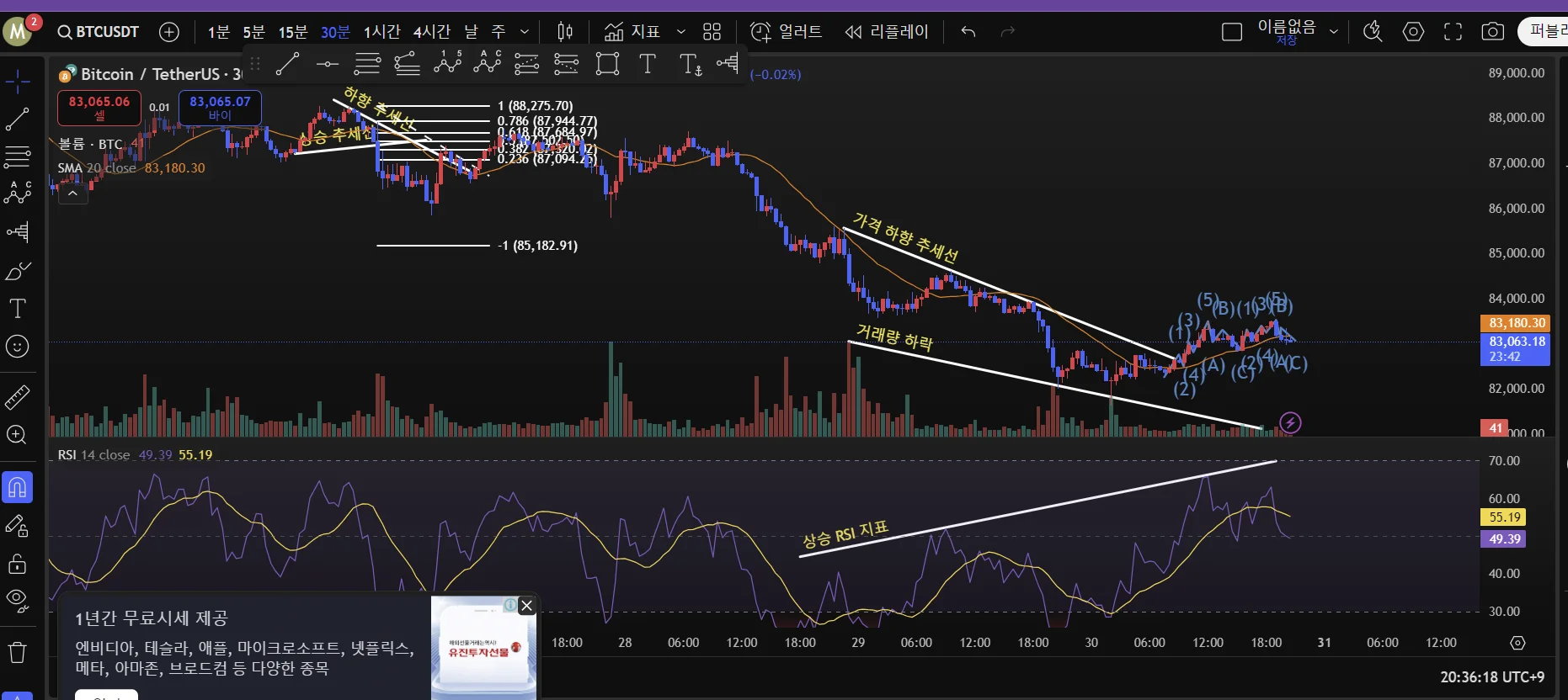 가격과 거래량은 하락하며 RSI는 상승 지표를 그리는 것을 보아 30분봉 차트에서 가격이 상승할 것을 암시한다고 판단하였습니다.