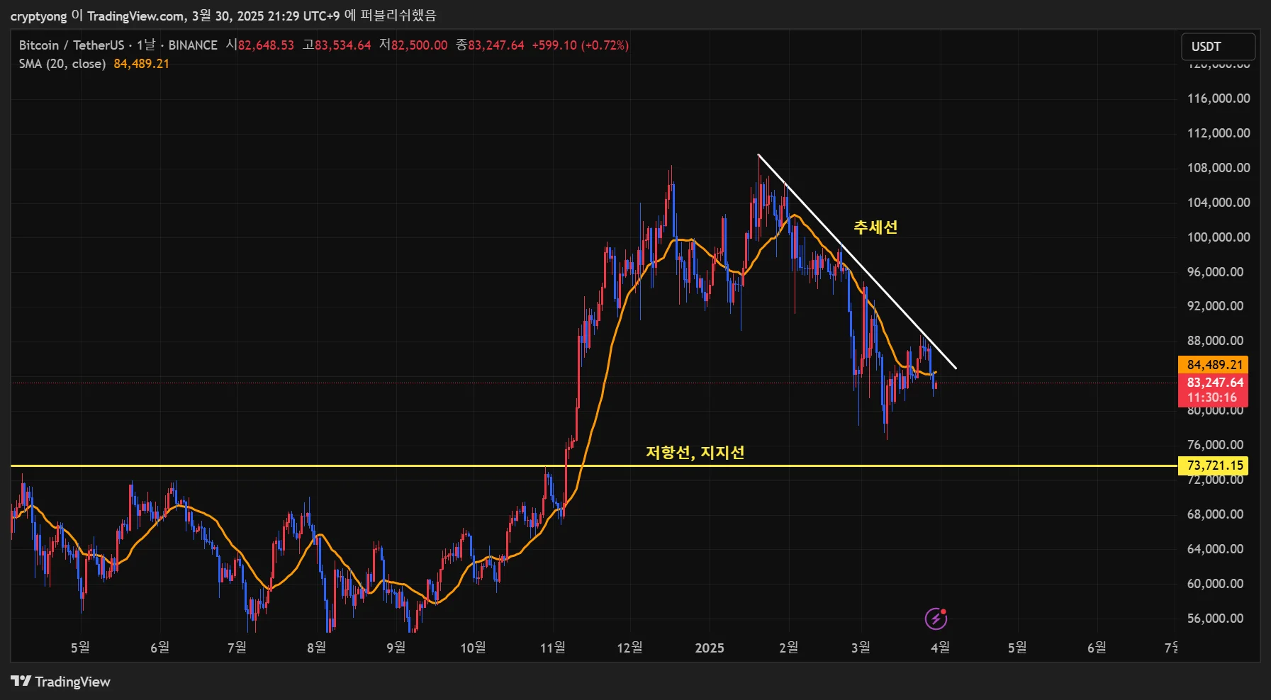 저항선이 지지선으로 바뀌어 73,721선에서 지지가 되는지 지켜봐야겠습니다.