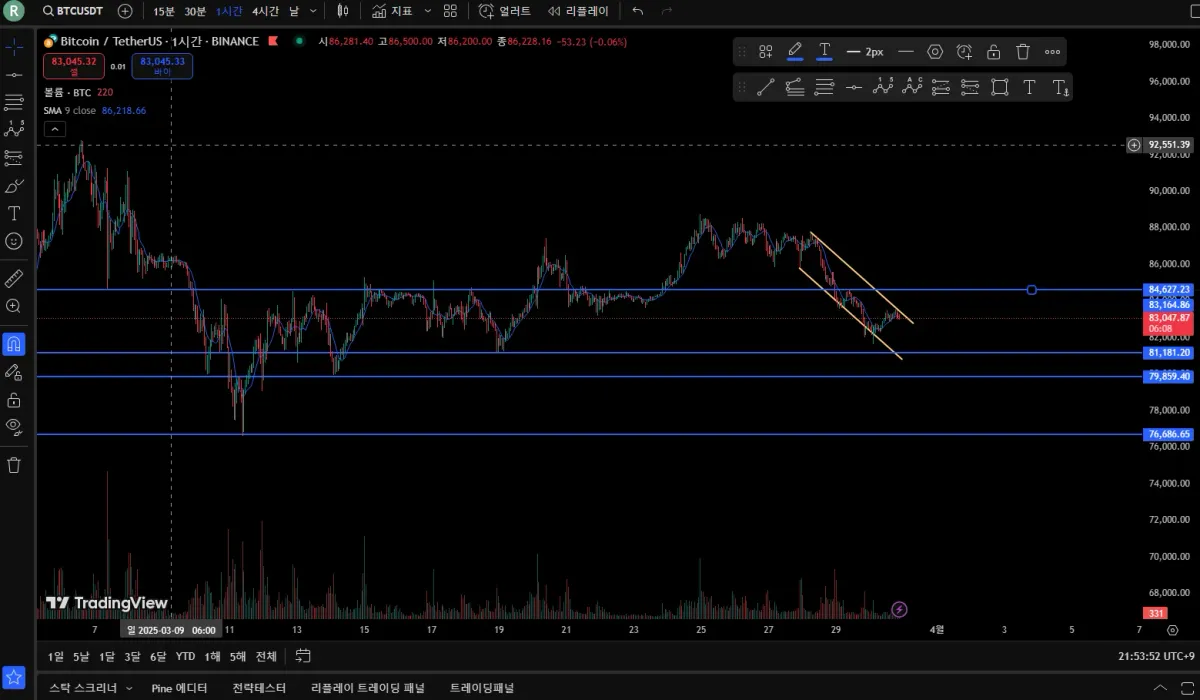계속해서 조정 들어갔다가 표시해둔 1차 지지선 81k에서 반등 못줄 시 2차 지지선 79k, 그것도 안되면 최대 76k까지 떨어질 것 같네요. 각 지지선에서 반등하면 불장 시작이고 마지막 지지선까지 저항 못해버리면 그대로 시즌 조욜이지 않을까...