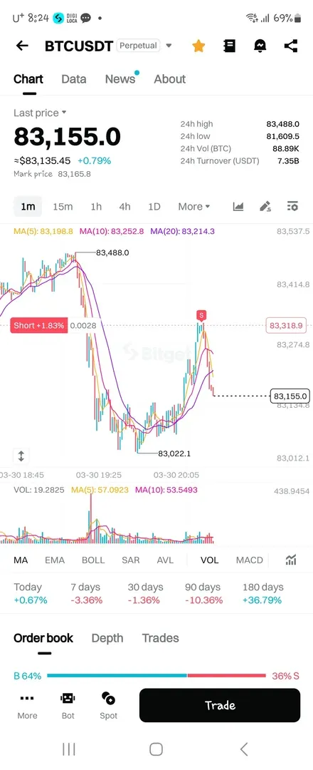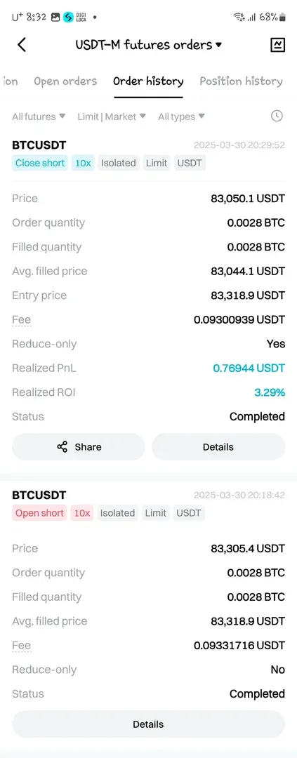 1분봉 시드10퍼 ×10 격리 / 숏 수익 = + 3.29퍼