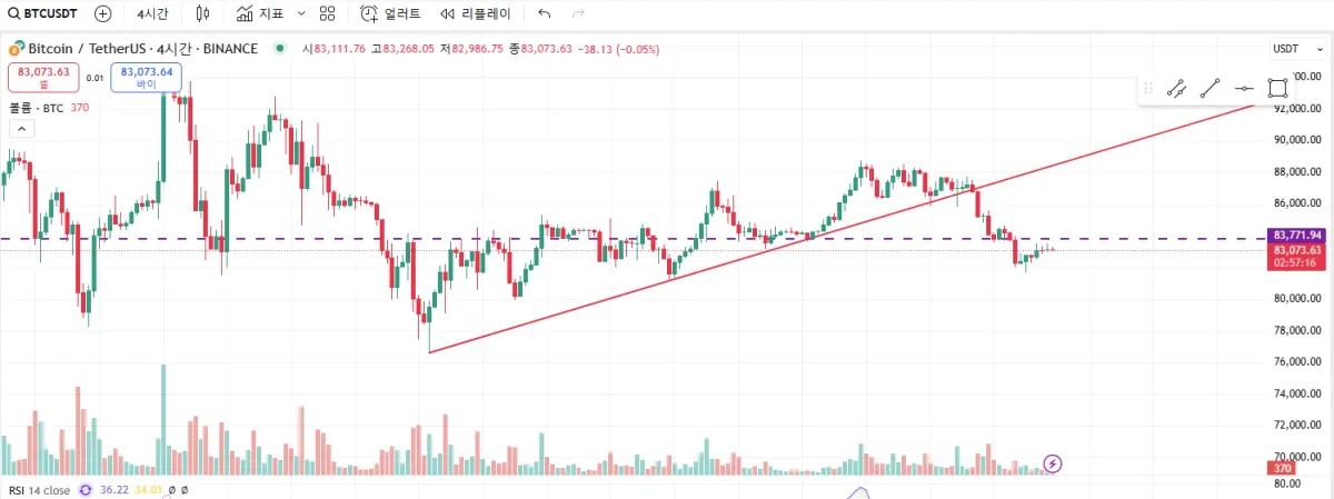 기존 4시간봉 추세선에서 하방으로 이탈하면서 가격이 크게 빠진 것 같았습니다.