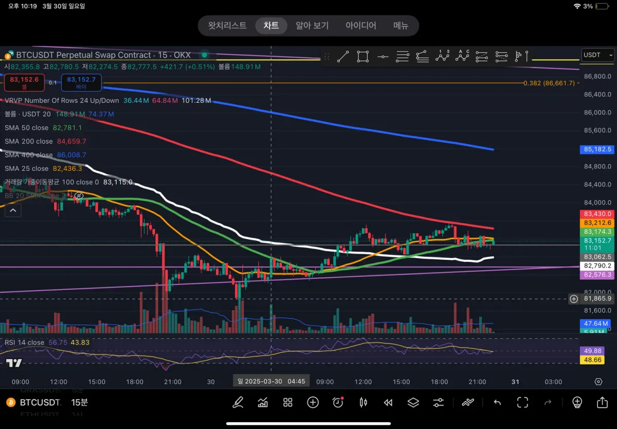현재 단기로 빨간색줄(200) 기준 터치 시 일부 익절하고, 4시간봉이나 1일봉을 참고하여 숏 헷징생각중.
