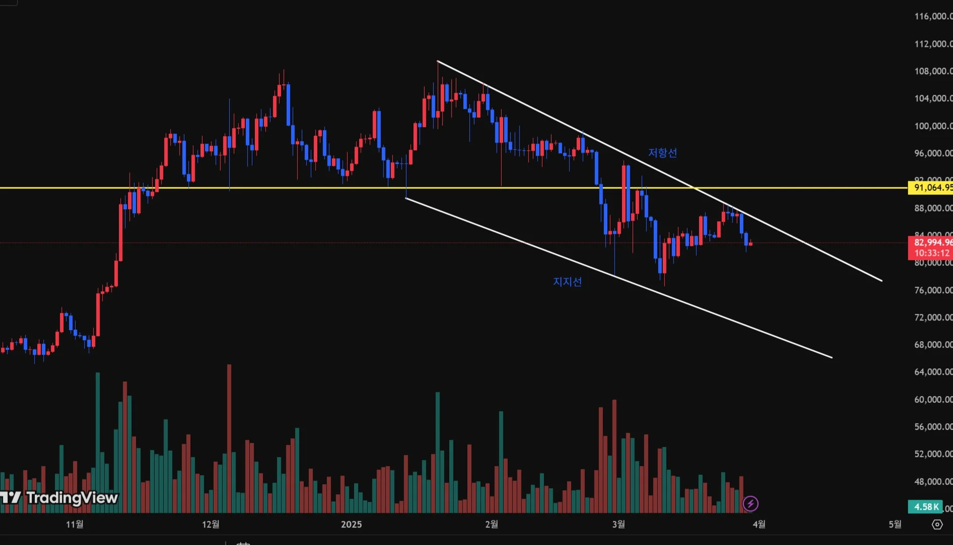 저항선에 닿았다가 떨어지는중이기 때문에 지지선에 닿을때까지는 쭉 떨어질것으로 예상됩니다.