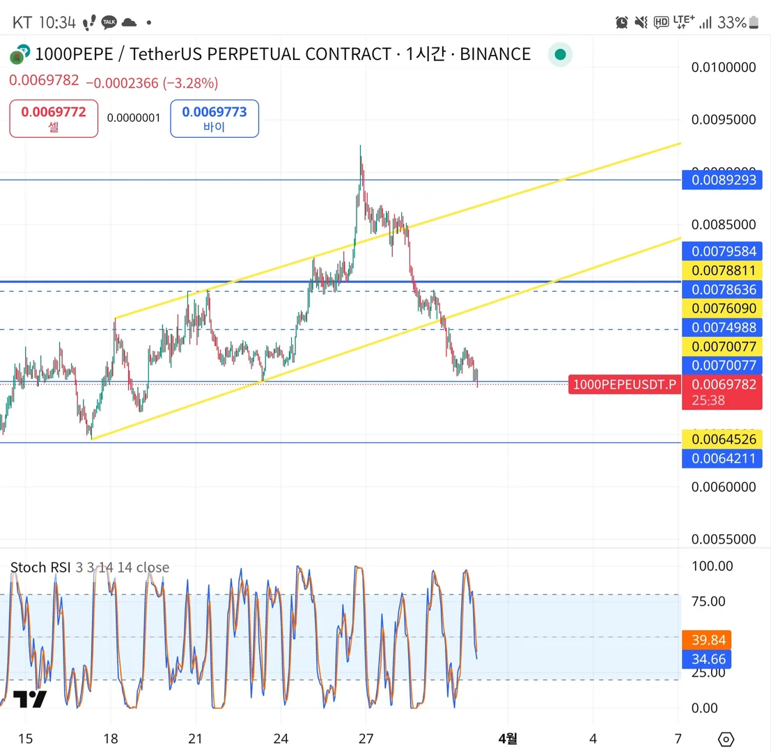 3. 한시간 봉으로 추세선이 깨졌고 지지선 돌파 여부를 확인중입니다. 유의미하게 돌파시 숏 진입을 고려중입니다.