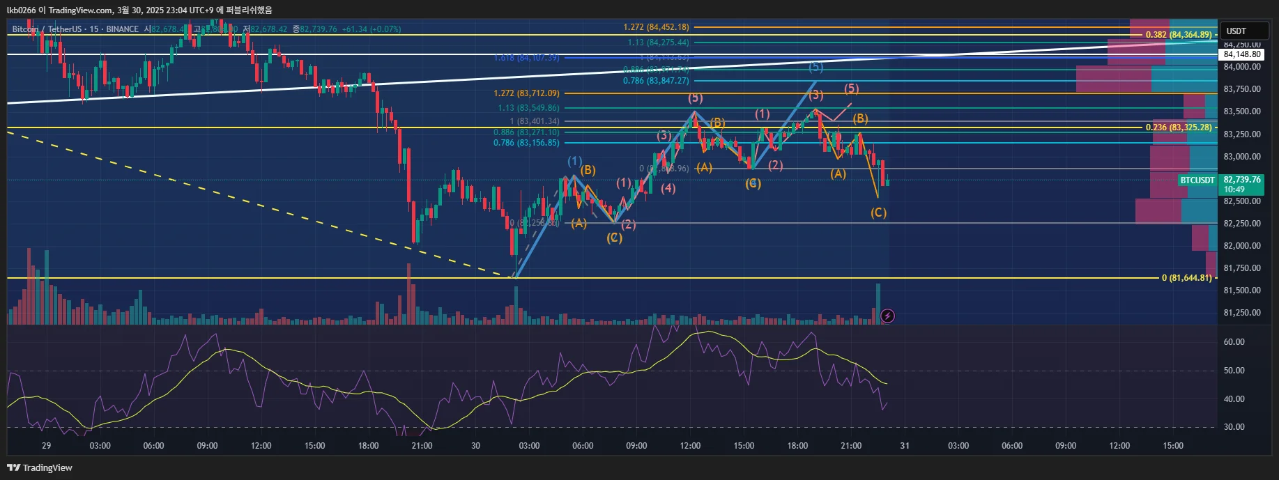 1시간 봉으로 임펄스 파동이 보였고... 15분 봉으로도 보는데 순간 어? 하면서 1, 3파에서 임펄스파동. 2, 4 조정이 보여 오 미쳤다 하면서..... 작도 후 5파동 작은 추세에서 불 태워서 익절하고자 하였지만... 큰 음봉이 뜨며 깨져버렸습니다. 바로 조정파동으로 넘어가며 매매 끝. 불 태우고 음봉 나오니 수익이 3분의 1이 되었어요. ㅜㅡㅜ 불 태우고 떨어져서 그런가보네요