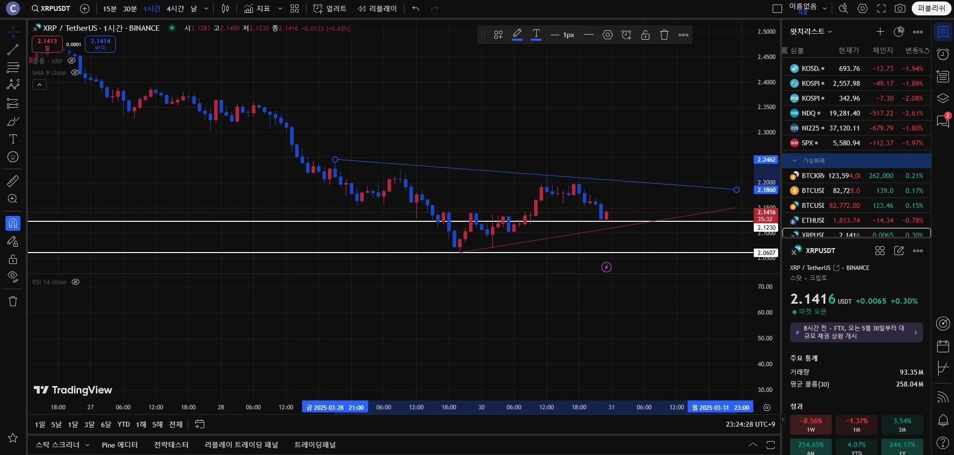 저항선에서 지지선으로 리테스트된 1차 저항선, 저가를 찍은 2차 지지선, 붉은 상승 추세선과 푸른 하락 추세선을 작도해 보았습니다.