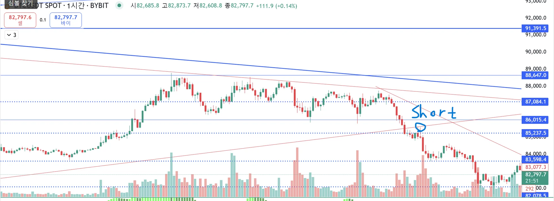 큰 하락추세선을 돌파하지 못하고 상승추세선을 뚫고 하락한 후 리테스트한 자리에서 숏 자리 진입했습니다. 저는 손절자리는 짧게 넥라인이자 4시간봉 지지라인으로 잡았고 익절자리는 밑에 4시간 지지라인인 81k대에에 잡았습니다