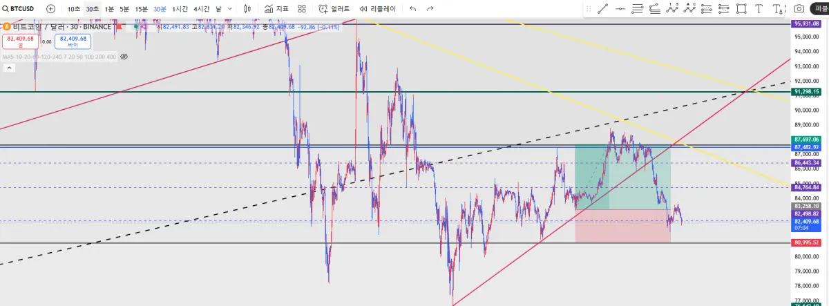 저번주에 모의 트레이딩한 결과입니다. 시간대 봉을 너무 길게 잡은 거 같아 수정하고 지지 저항선에 따라 다시 수정했습니다.