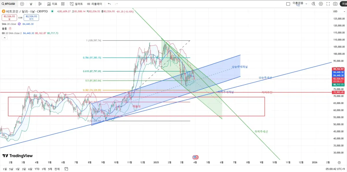 제가 생각하는 매물대, 상숭추세선,하락추세선,지지라인,상승추세채널 ,하락추세 채널을 작도해보았습니다.