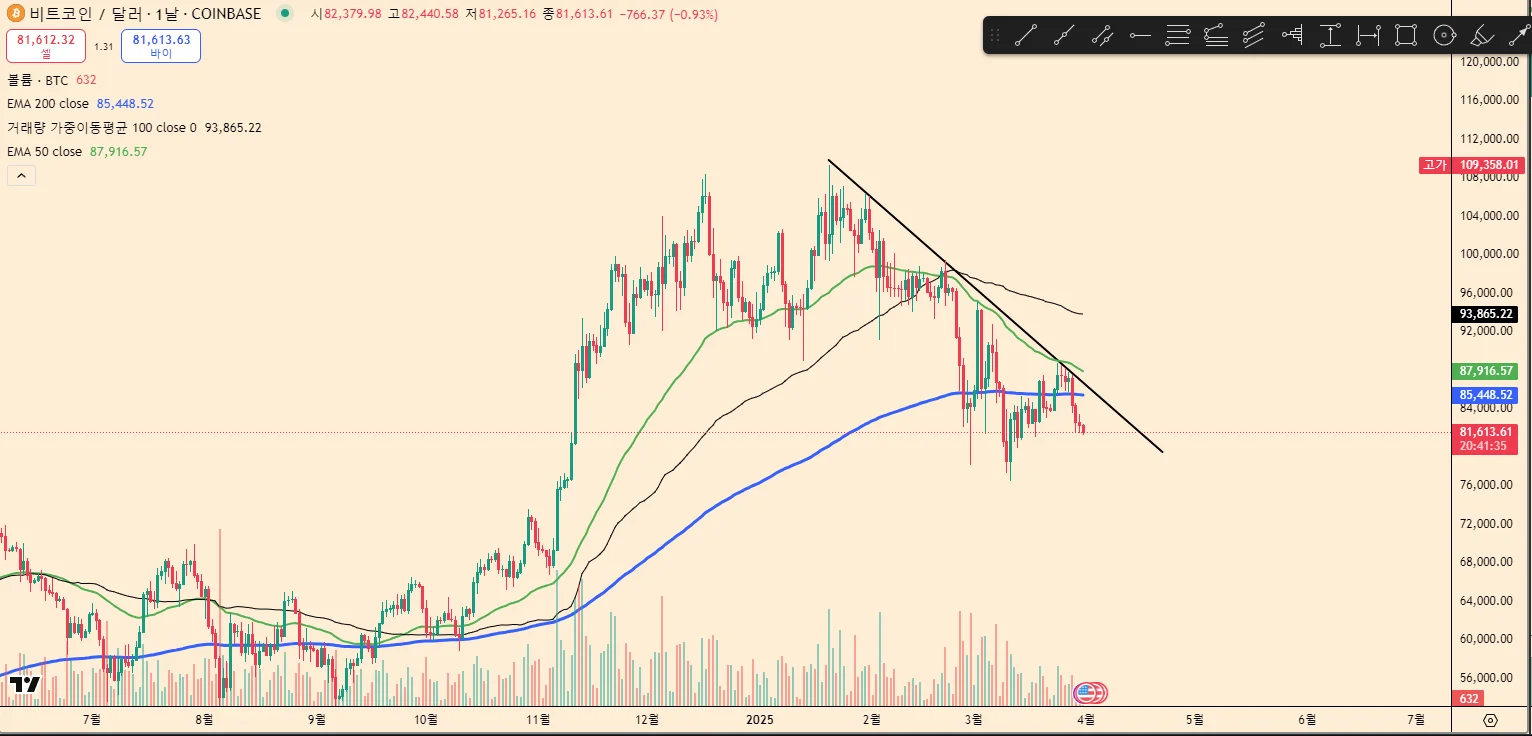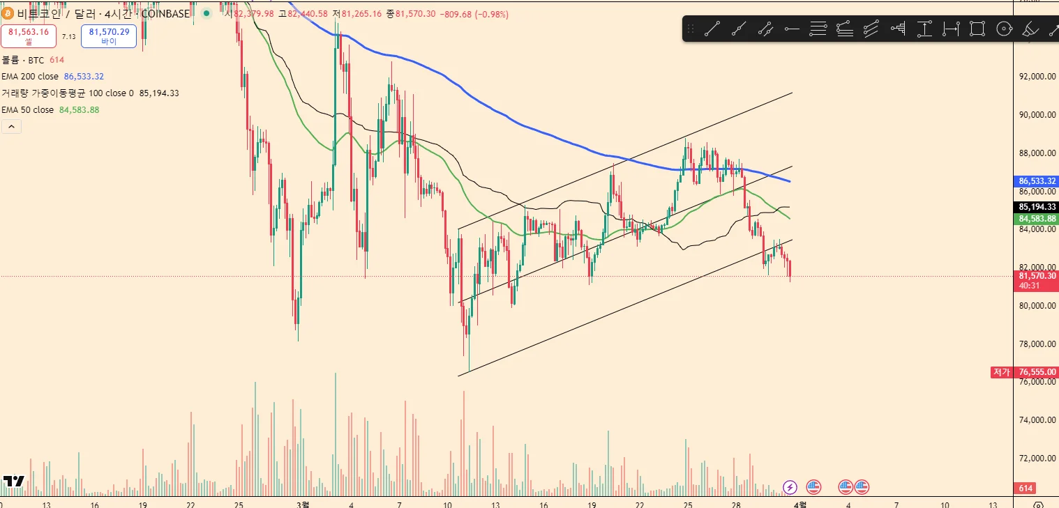 그나마 있던 4시간봉의 상승추세도 이탈된 상태이기에 숏 포지션을 중점으로 가져가는 것이 좋을 것이라고 생각합니다