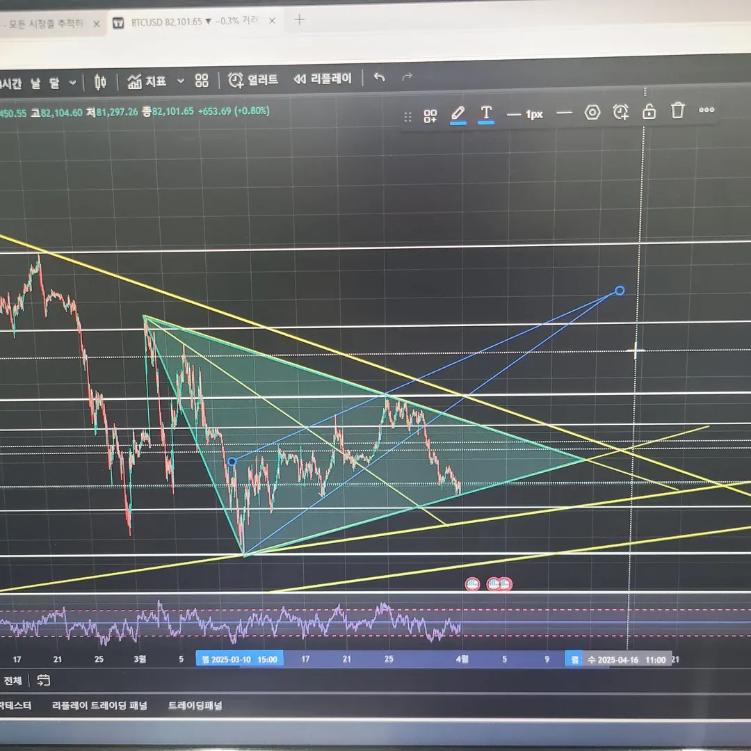 현재 1시간 봉 기준으로 단기적 관점은 노란색 일봉 기준 저점 추세선을 지지하여 버텨주는 형세인거 같습니다 이탈 여부가 중요하겠고 이탈한다면 약 8만달러 지지선까지는 도달할거 같습니다. 반등한다면 1시간 저항선을 돌파 지지하여야 상방으로 열릴거 같습니다 다만 삼각형대의 오른쪽 꼭지점에 다달아서야 진짜 상방이나 하방의 가늠이 가능할거 같습니다