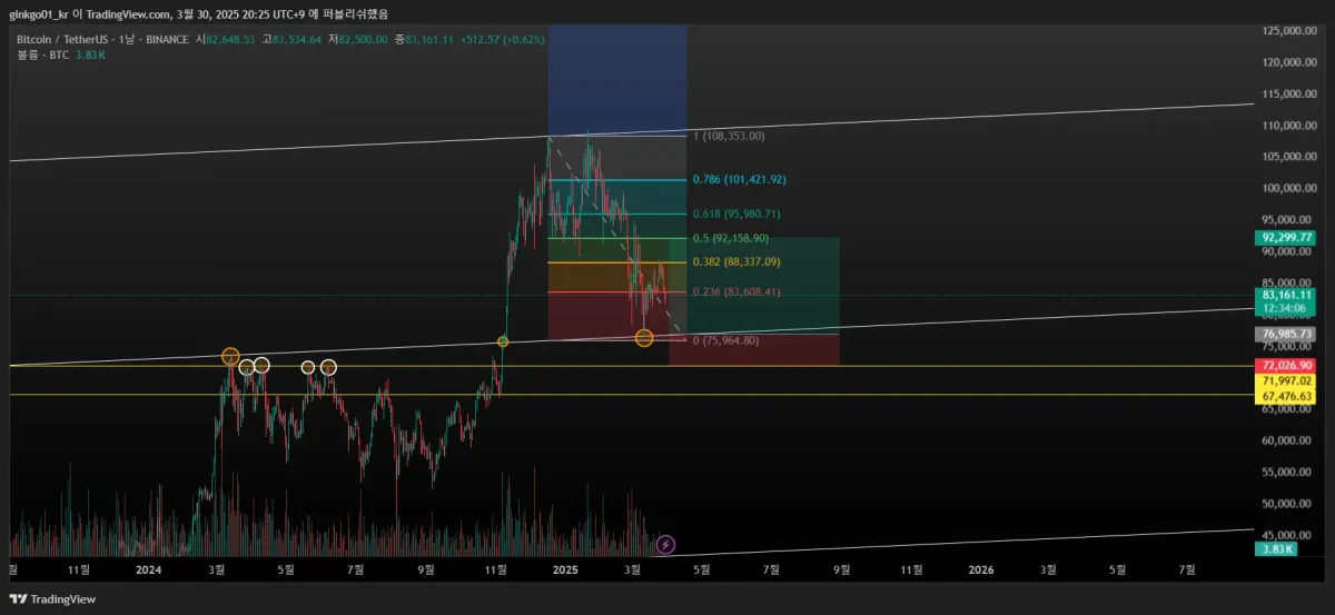 현재 하락국면에 있다고 판단되며 추세선상 76k를 맞고 반등을 할 가능성이 크다고 보며 조금씩 저점을 높이며 상승할 것이라고 판단됩니다!