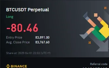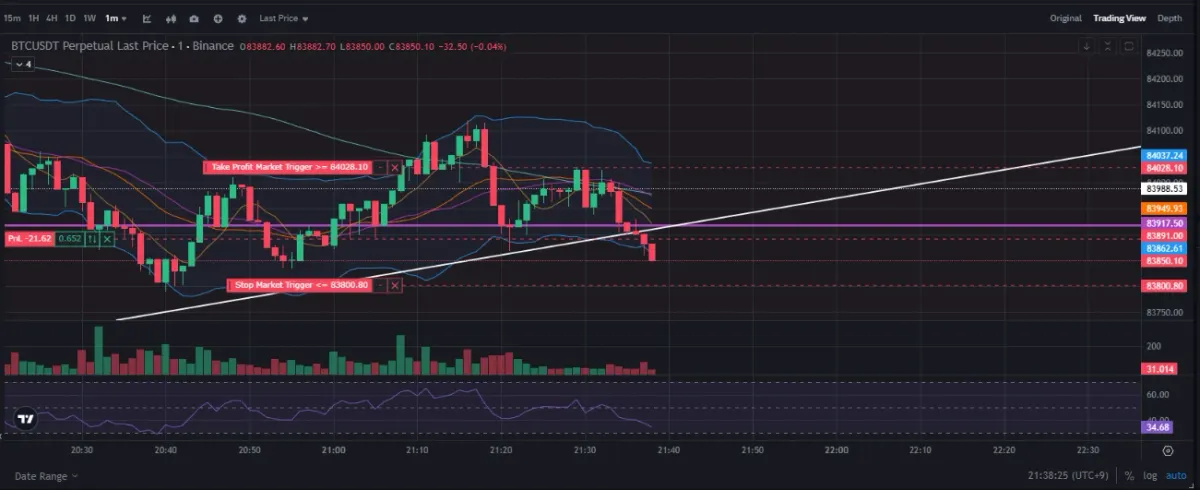 1분봉 기준으로 볼린저밴드 하단 이탈, 5분봉 추세선, 1시간 지지선의 영향으로 반등 예측하고 롱포지션 들어갔으나,