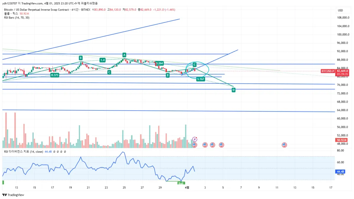 추세선 이탈후 단기적 꾀큰하락 하락 a b c 파동이 나올수도 있을만한 상황 아직은 매매 안하고 추격중 개인적으로 가장 중요자리가 75 K 일꺼로 보여요