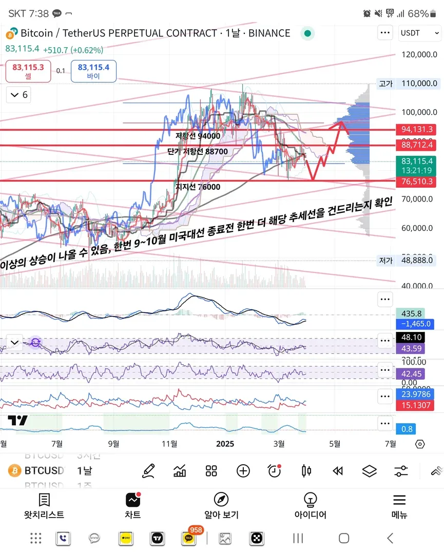 *현재 가격대에서 76.5k까지 한차례 더 하락한 후 88.7k를 뚫고 지지해 주는 모습이 보인다면 94~96k까지의 상승을 노려 볼 수 있겠습니다.