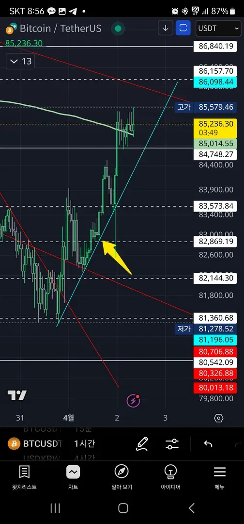 1시간 지지선과 파란 상승추세선의 지지를 받는것을 보고 상승하겠다 판단하여 진입해보았어요. 익절라인에서 캔들이 지속적으로 윗꼬리가 달리는 것을 보고 하방으로 누르는 힘이 좀 작용하는 것 같단 생각이 들어 익절하였습니다.