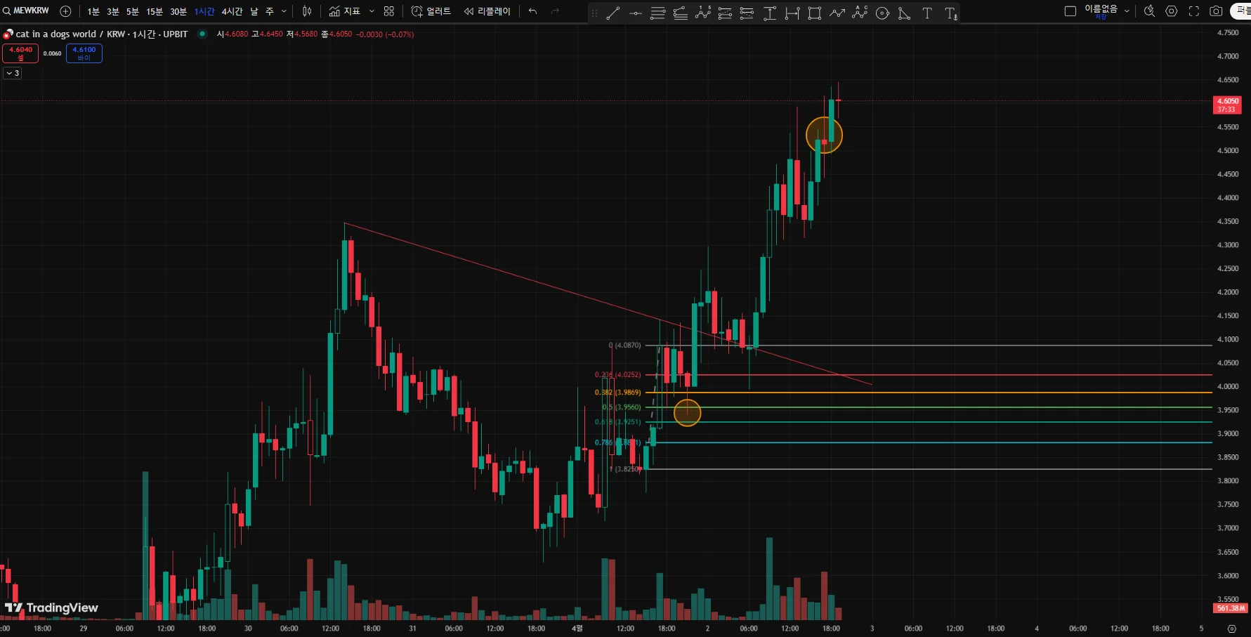 0.5자리인 0.3956자리에서 지지하는 모습이 보여서 들어감.