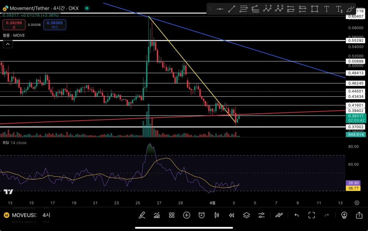 4시간봉으로 봤을때 지지구간 만들어주면서 반등 중이라 매수했습니다.