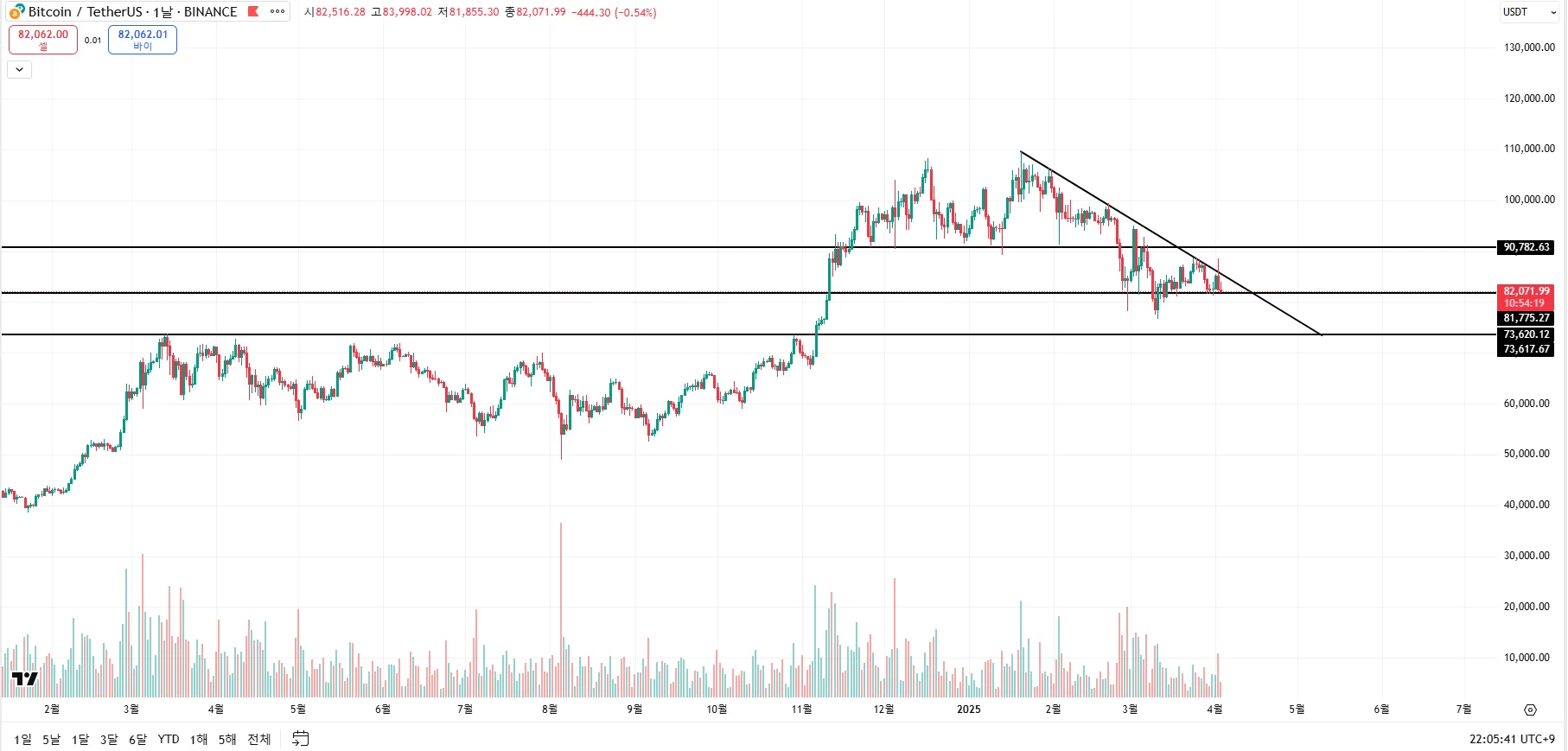30일 챌린지[30일 챌린지 22기 1주차] BTCUSDT 일봉 지지 저항 추세선 작도 입니다