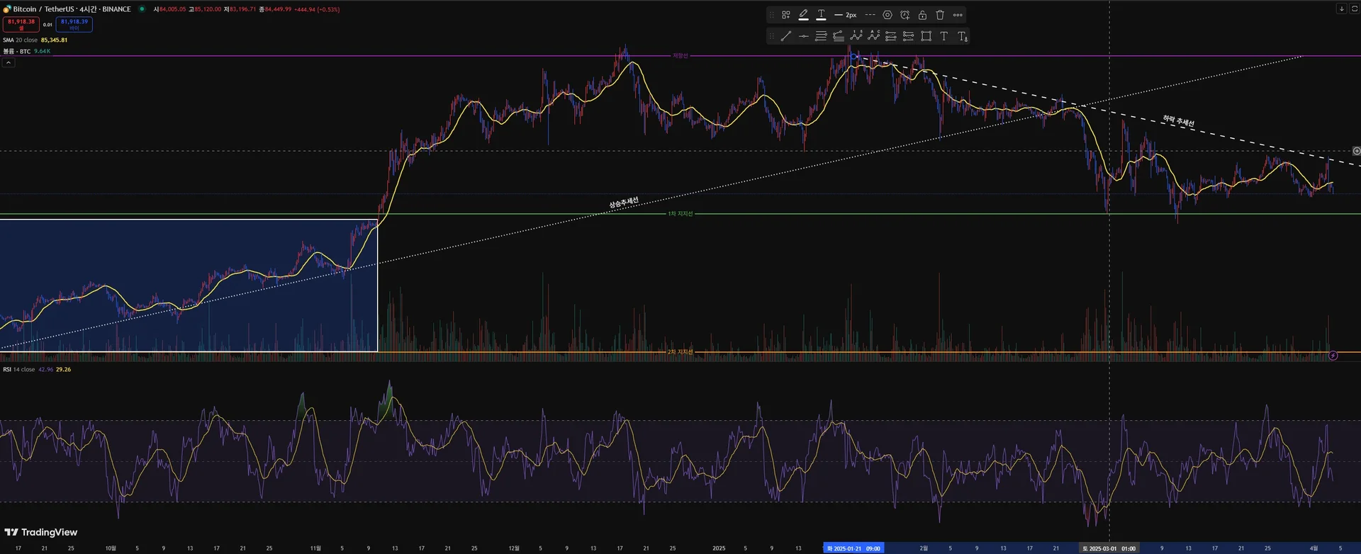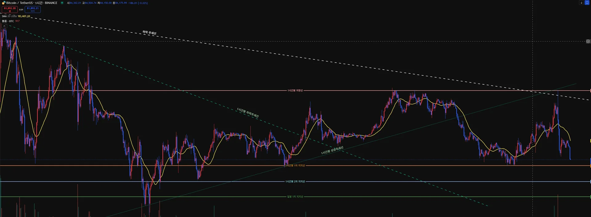 일봉 기준으로 추세 및 지지 작도를 해봤는데 "그럼 4시간봉에서는 어떻게 나올까? 1시간봉에서는 어떻게 나올까?" 궁금해서 차트를 봤는데