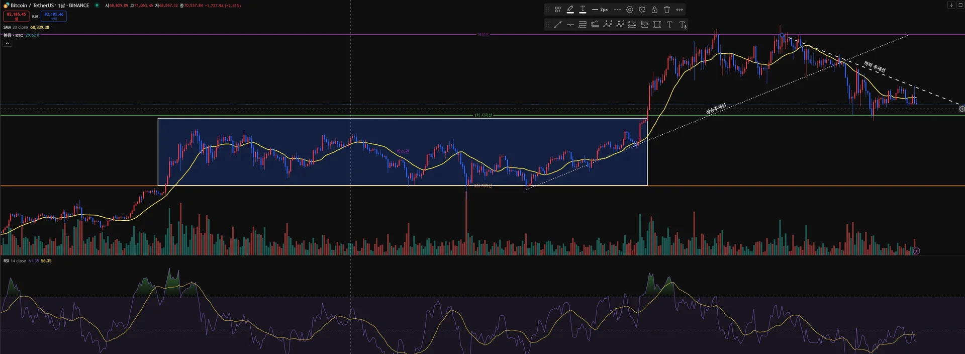 [30일 챌린지 22기 1주차] BTCUSDT 일봉 지지선, 상승 하락 추세선 작도