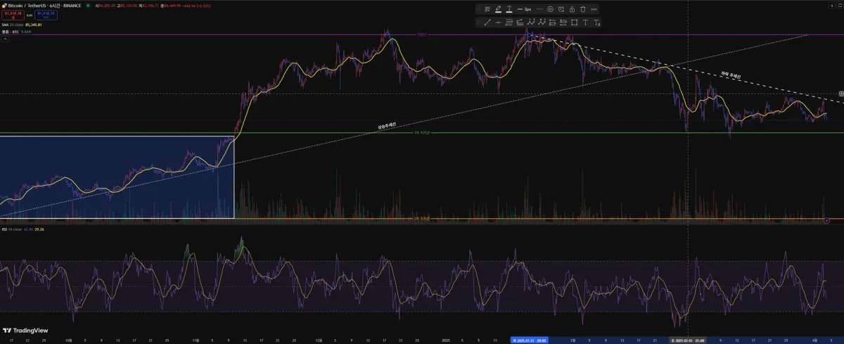 일봉 기준으로 추세 및 지지 작도를 해봤는데 "그럼 4시간봉에서는 어떻게 나올까? 1시간봉에서는 어떻게 나올까?" 궁금해서 차트를 봤는데