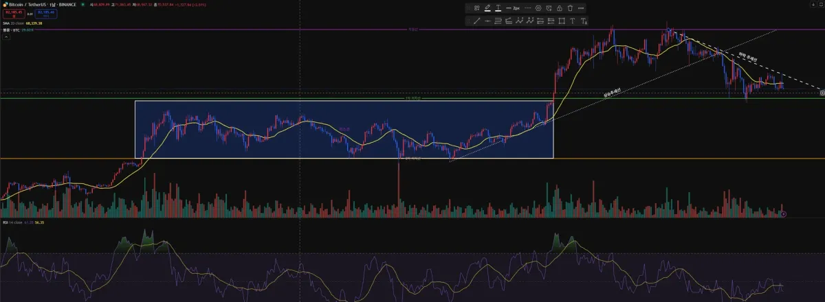 7일 챌린지[30일 챌린지 22기 1주차] BTCUSDT 일봉 지지선, 상승 하락 추세선 작도